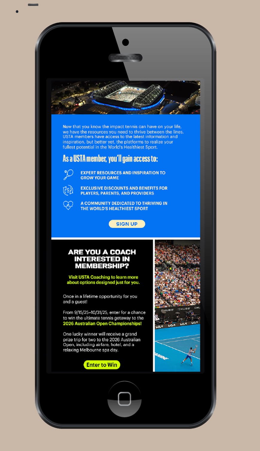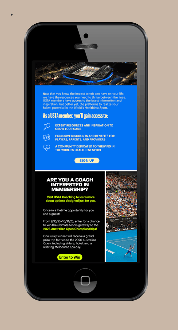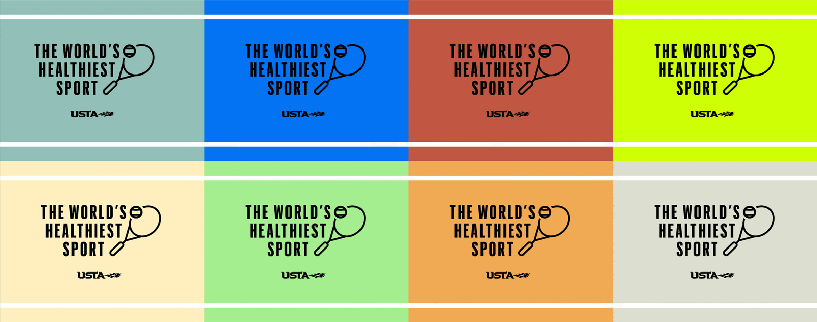 The World’s Healthiest Sport” was a nation wide campaign promoting tennis for physical and mental wellbeing. The campaign featured billboards, signage, banners, print and digital advertisements, and social media content deployed across high-traffic areas, tennis clubs, and community centers. Static assets including postcards, posters, pop-up banners, and branded merchandise were distributed at grassroots events and tournaments. I created the comprehensive WHS toolkit for consistent implementation across all 17 USTA sections nationwide, providing each region with the resources to celebrate tennis as an accessible, health-promoting sport.